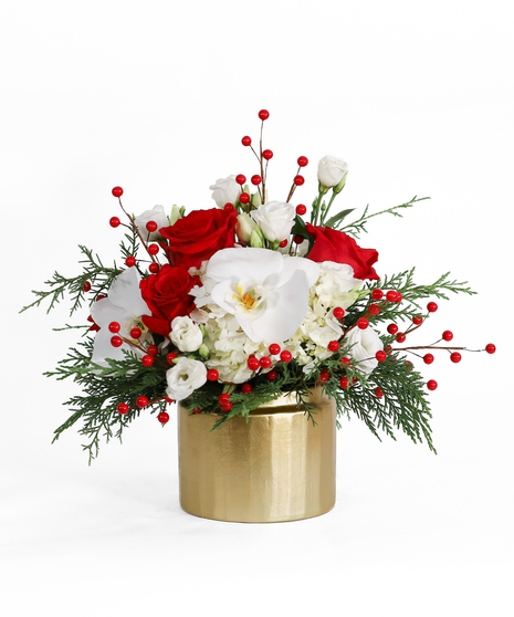 Celebrate the season in style with Crimson & Gold! Stunning red roses, white hydrangea, lisianthus, and orchids are artfully arranged in a gleaming gold ceramic container. This luxurious design captures the magic of Christmas with timeless beauty and modern sophistication.