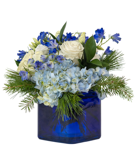 Celebrate the beauty of Hanukkah with the Festival of Lights Bouquet. This elegant arrangement features vibrant blue delphinium, pure white lisianthus, and lush white roses nestled among fragrant winter greens. Presented in a striking blue container, this design captures the festive spirit and timeless charm of the season. Perfect for lighting up your celebrations!
