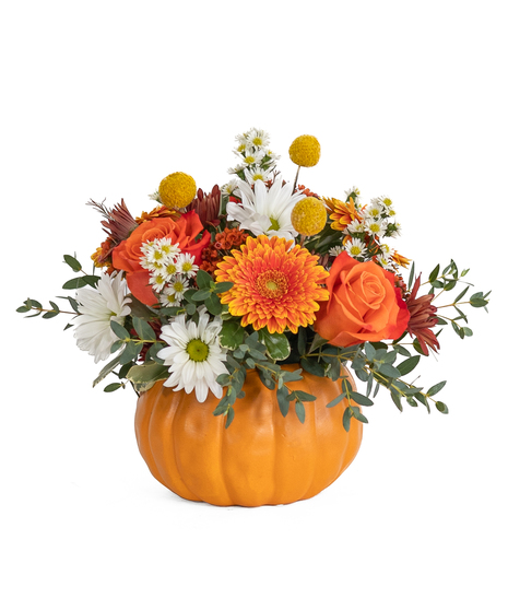 A festive fall arrangement with orange roses, mini gerbera daisies, white daisies, butterscotch mums, wax flower, and more, all designed in a charming white ceramic pumpkin.