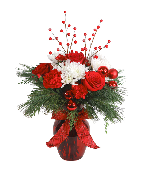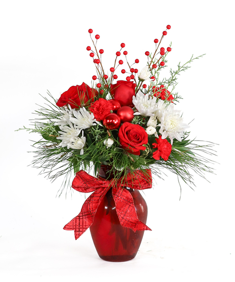 A merry arrangement of red roses, carnations, and seasonal mums that sings with holiday charm.