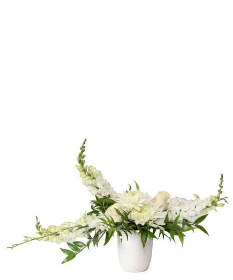 A lovely all white design of snapdragons, roses, magnum mums, dendrobium orchids and greenery that perfectly expresses your feelings during a time of loss.