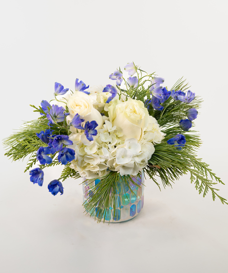 Merriest Mosaic epitomizes pure elegance with an all-white arrangement featuring the softness of roses and hydrangeas, complemented by the ethereal touch of blue delphinium and wintergreens. This captivating design flourishes within a distinctive blue mosaic vase, seamlessly blending sophistication with a serene winter ambiance. Its harmonious combination of delicate blooms and cool hues creates an enchanting centerpiece, evoking a sense of tranquility and refined beauty.