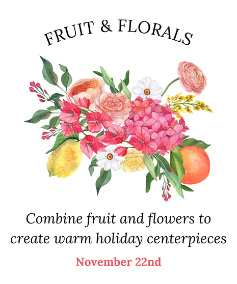Combine fruit and flowers to create Thanksgiving centerpieces just in time for hosting. Learn how to create low-profile centerpieces featuring warm-toned flower to create the perfect holiday tablescape. This hands-on workshop will allow your creativity to bloom as our designers walk you through each step.