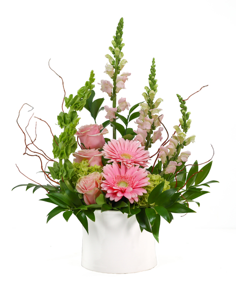 A soft, elegant floral design featuring light pink gerbera daisies, snapdragons, bells of Ireland, and mixed accents arranged in a white ceramic container. Perfect for adding a gentle, fresh touch of beauty to any space or occasion.