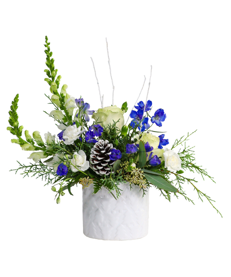 A crisp winter arrangement featuring white roses, snapdragons, and mini carnations accented with vibrant blue blooms, snowy pinecones, and fresh winter greens—all styled in a textured white ceramic container for an elegant seasonal touch.