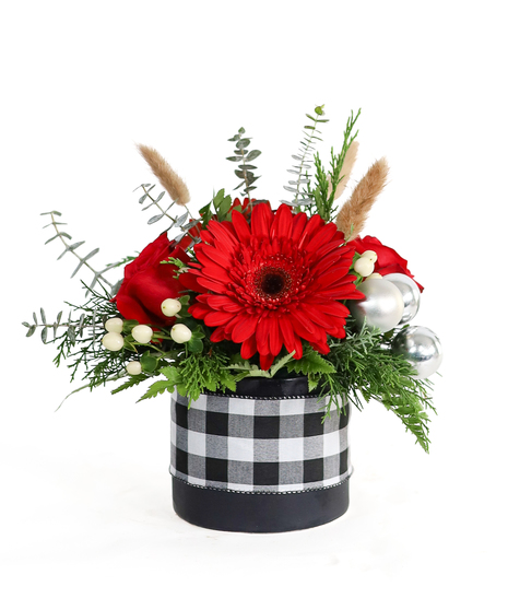 Classic red and white blooms accented with winter greens in a black container, finished with a buffalo black ribbon for festive sophistication.