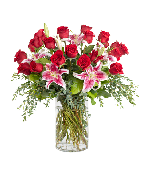 This breathtaking arrangement of two dozen red roses paired with fragrant lilies is the perfect expression of love and admiration. Presented in a clear glass vase with lush greenery, it’s a timeless gift that leaves a lasting impression