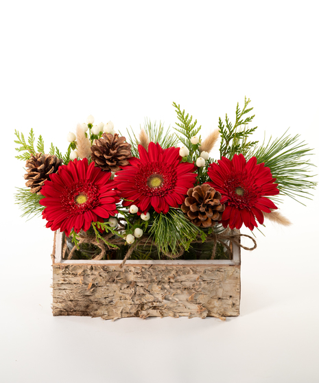This lovely trio container features three vibrant red Gerbera daisies nestled in a charming birch container. Adorned with wintergreen foliage and pinecone accents, this arrangement captures the essence of the season's rustic beauty. Perfect for adding a touch of warmth and nature-inspired elegance to your space, this delightful trio makes a unique and eye-catching decor choice for the winter months. Bring the outdoors in with this rustic, yet refined, floral arrangement.