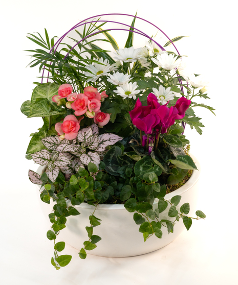 All My Love is an expansive European garden exuding romance, featuring a harmonious composition of vibrant mum, begonia, cyclamen, and assorted green plants. Nestled in a pristine white ceramic container, this garden is a testament to love and elegance. The addition of purple Midillino accents enhances its charm, creating a stunning Valentine's Day display that is both enchanting and timeless.